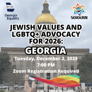 Join SOJOURN and Georgia Equality on Tuesday, December 2 at 7 PM ET on Zoom as we prepare for Georgia's 2026 legislative session! We'll ground in our Jewish values and review expected types of anti-LGBTQ+ legislation we're expecting to see proposed in the state next year. Register here.