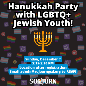 The next event for GEWS, SOJOURN's LGBTQ+ Jewish youth group, will be taking place on Sunday, December 7 from 2:15-3:30 PM. We'll be gathering in community for a Hanukkah-themed party with food, dreidels, and fun! Youth/families can RSVP by emailing [email protected], and exact location details will be sent to those who RSVP. We hope to see you there!